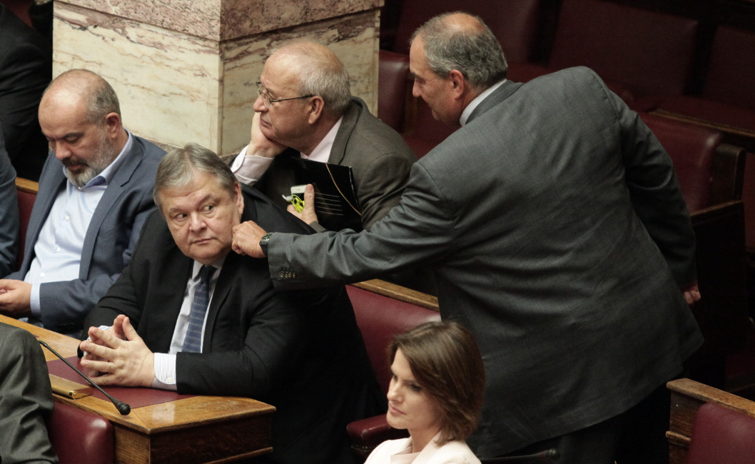 Την ώρα που ο Ευάγγελος Βενιζέλος παρακολουθεί προσηλωμένος τη συζήτηση στη Βουλή, ο πρώην πρόεδρος της ΝΔ, Κώστας Καραμανλής, τον πλησίασε και του τσίμπησε το μάγουλο.