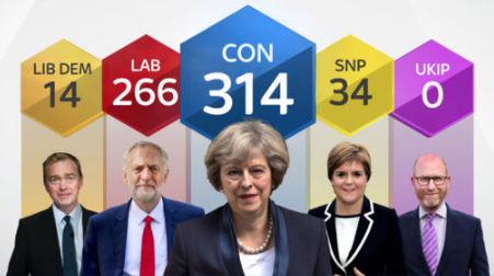 Η πρόβλεψη του εκλογικού αποτελέσματος δίνει 314 έδρες στους Συντηρητικούς, 266 στους Εργατικούς, 34 έδρες στο Εθνικό Κόμμα της Σκωτίας (SNP) της Νίκολα Στέρτζον, 14 για τους Φιλελεύθερους Δημοκράτες και καμία έδρα για το ευρωσκεπτικιστικό και αντιμεταναστευτικό Κόμμα Ανεξαρτησίας UKIP.