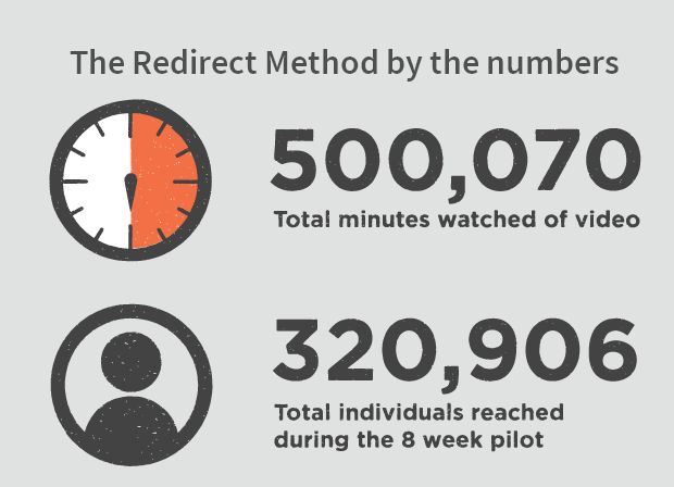 Με τη μέθοδο Redirect, 320.906 άνθρωποι που θεωρήθηκε από την υπηρεσία ότι ήταν επιρρεπείς στην ρητορική του ISIS παραπέμφθηκαν και τελικά παρακολούθησαν συνολικά 500.070 λεπτά βίντεο με τις καταθέσεις ανθρώπων που τελικά αποσκίρτησαν, με συζητήσεις κατά του εξτρεμισμού κ.ά.