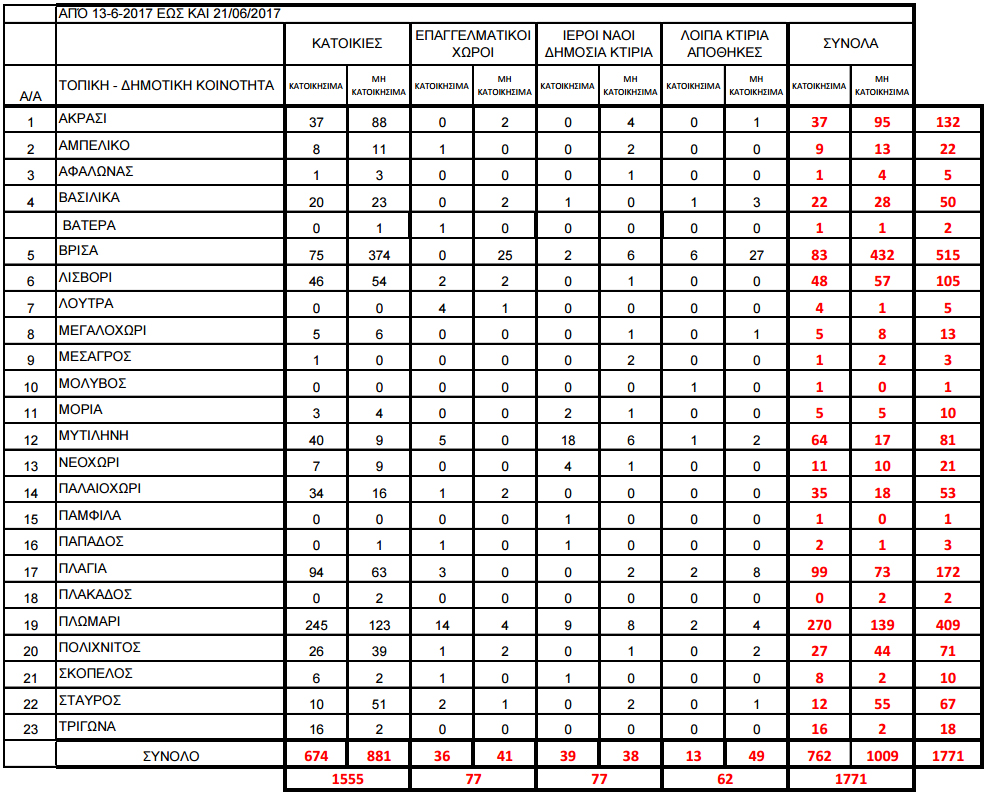 Τα 881 από τα μη κατοικίσιμα κτίρια αφορούν κατοικίες και τα υπόλοιπα επαγγελματικούς χώρους, εκκλησίες και αποθήκες.