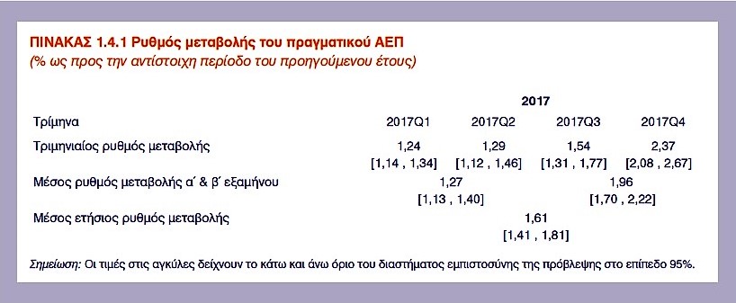 Σημειώνεται, «ότι ενώ η πρόβλεψη για το πρώτο εξάμηνο του 2017 ενσωματώνει μία αναθεώρηση προς τα κάτω τής αμέσως προηγούμενης πρόβλεψης του υποδείγματος παραγόντων (2,1%), οι εξαμηνιαίες εκτιμήσεις παραμένουν συνολικά ευνοϊκές και καταδεικνύουν ξεκάθαρα μία ανοδική τάση. Η τάση αυτή αντανακλάται και στους εκτιμώμενους τριμηνιαίους ρυθμούς μεταβολής για τα τέσσερα τρίμηνα του 2017, ως προς τα αντίστοιχα τρίμηνα του προηγούμενου έτους, οι οποίοι διαμορφώνονται στο 1,2%, 1,3%, 1,5% και 2,4%».