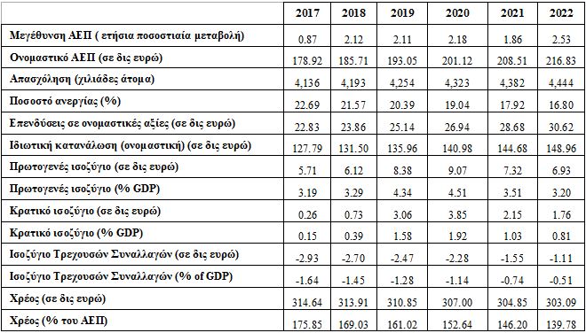 Ο Πίνακας 1 παρουσιάζει τις εκτιμήσεις μέχρι το 2022 για βασικά μακροοικονομικά μεγέθη της ελληνικής οικονομίας.