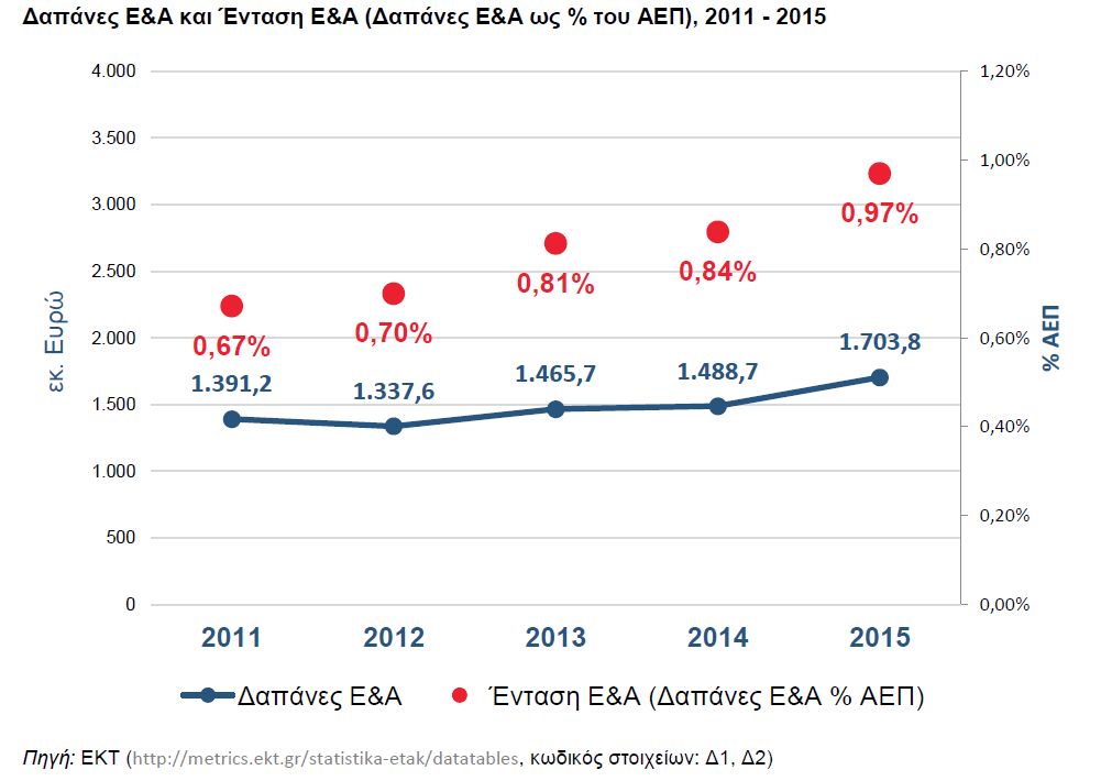 Ο δείκτης «Ένταση Ε&Α», ο οποίος εκφράζει τις δαπάνες σε συγκεκριμένους τομείς ως ποσοστό του ΑΕΠ, διαμορφώθηκε στο 0,97%, από 0,84% το 2014, κάτι που μεταφράζεται και σε βελτίωση της σχετικής θέσης της χώρας μεταξύ των κρατών – μελών της Ευρωπαϊκής Ένωσης. Συγκεκριμένα, η Ελλάδα βρίσκεται στην 16η θέση ως προς τις δαπάνες Ε&Α και στην 22η θέση σε ό,τι αφορά την Ένταση Ε&Α. Ο ευρωπαϊκός μέσος όρος για την Ένταση Ε&Α ήταν 2,03%.