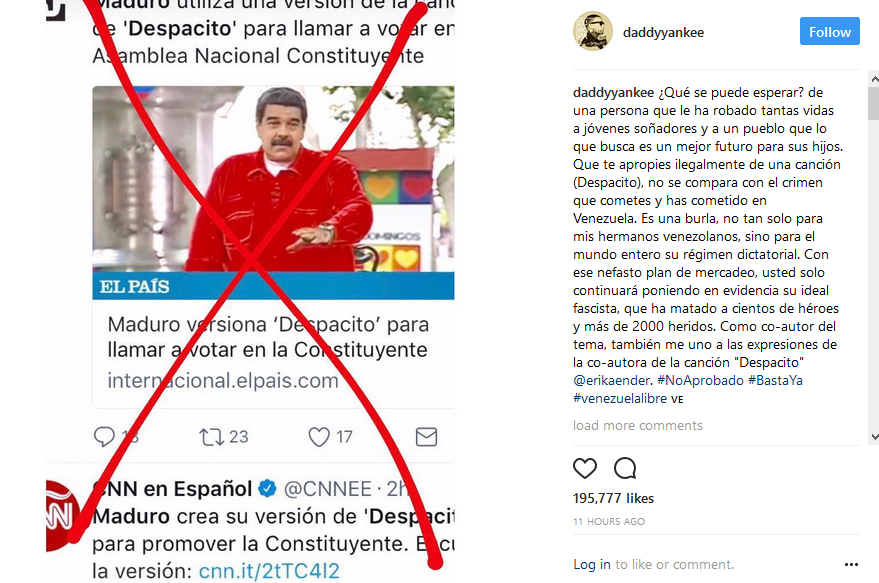 » Το να κλέψεις ένα τραγούδι (Despacito) δεν συγκρίνεται με τα εγκλήματα που έκανες και κάνεις κατά της Βενεζουέλας. Είναι γελοίο το δικτατορικό καθεστώς του, όχι μόνο για τα αδέλφια μου τους βενεζολάνους, αλλά για όλο τον κόσμο.»