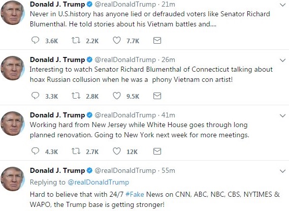 Έπειτα, αφιερώνει και μερικά tweet στον γερουσιαστή Ρίτσαρντ Μπλούμενταλ του Κονέκτικατ, ο οποίος φαίνεται να αναφέρθηκε στην υπόθεση με τη φερόμενη ρωσική εμπλοκή. Ξεκινά την «απάντησή» του λέγοντας πως ο Μπλούμενταλ ήταν «τσαρλατάνος απατεώντας του Βιετνάμ», λέγοντας πως «ποτέ κανείς στην αμερικανική ιστορία δεν είπε ψέματα ή εξαπάτησε τους ψηφοφόρους όπως ο Μπλούμενταλ».