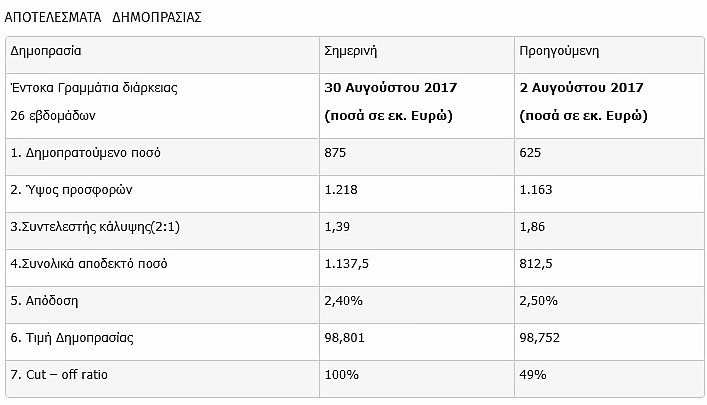 «Σήμερα διενεργήθηκε δημοπρασία εντόκων γραμματίων διάρκειας 26 εβδομάδων, ύψους 875 εκατομμυρίων Ευρώ. Η απόδοση διαμορφώθηκε στο 2,40%. Υποβλήθηκαν συνολικές προσφορές ύψους 1,218 δισεκατομμυρίων Ευρώ, πού υπερκάλυψαν το ζητούμενο ποσό κατά 1,39 φορές.