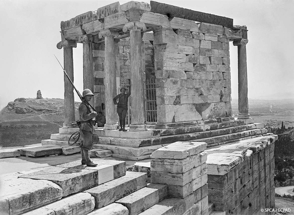 Στην δεύτερη ενότητα βλέπουμε «Ημέρες πολέμου», μέσα από φωτογραφίες που τραβήχτηκαν για προπαγανδιστικούς λόγους. Φυσικά και δεν πρόκειται για τουρίστες που τραβούν φωτογραφίες σε μια ταραγμένη και φορτισμένη ιστορική εποχή. Το πολυβόλο των Γάλλων συμμάχων είναι στημένο πάνω στην Ακρόπολη, σκοπιές περιπολούν πάνω και γύρω από τον Ιερό Βράχο, αξιωματικοί επιθεωρούν, ο Γάλλος στρατηγός ξεναγείται στην Ακρόπολη, στρατιωτικές σκηνές είναι στημένες στο ιερό του Διονύσου. Ένας φαντάρος μπαλώνει τη στολή του καθισμένος πάνω σε αρχαίο βωμό.