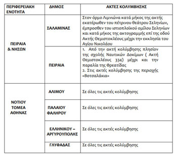 Ειδικότερα πέραν των αναφερομένων στην αρχική σχετική Υπουργική Απόφαση του 2017 απαγορεύεται η κολύμβηση στα θαλάσσια ύδατα των περιοχών της Περιφέρειας Αττικής, τα οποία έχουν υποστεί φαινόμενα βραχυπρόθεσμης ρύπανσης, όπως αυτές αναφέρονται κατωτέρω: