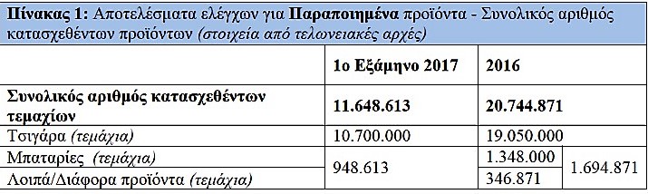 Στο διάστημα Ιανουαρίου – Σεπτεμβρίου 2016 διενεργήθηκαν 4.531 έλεγχοι, με τις κατασχέσεις να ανέρχονται στα 363,9 εκ. τεμάχια τσιγάρα.