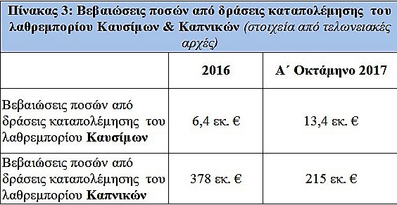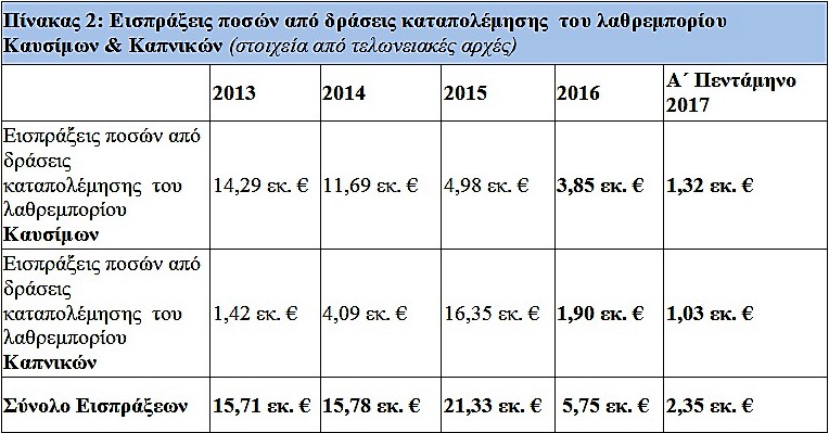 Οι έλεγχοι που διενεργούνται στα καπνικά, αν και έχουν καλύτερα αποτελέσματα για τα δημόσια έσοδα, ωστόσο δείχνουν ότι το λαθρεμπόριο αποστερεί από το ελληνικό Δημόσιο τεράστια ποσά εσόδων. Σύμφωνα με τα στοιχεία της διεύθυνσης στρατηγικής τελωνειακών ελέγχων και παραβάσεων: