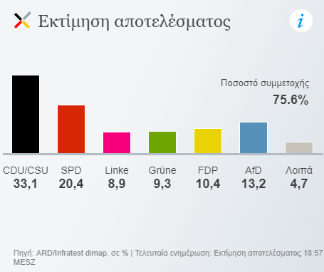 Στην τελευταία δημοσκόπηση, που δημοσιεύτηκε το Σάββατο στην εφημερίδα Bild, τα δύο χριστιανικά κόμματα συγκεντρώνουν συνολικά 34% των ψήφων, οι Σοσιαλδημοκράτες 21%, η Εναλλακτική για τη Γερμανία 13%, η Αριστερά 11%, οι Φιλελεύθεροι 9% και οι Πράσινοι 8%. Αν επιβεβαιωθούν τα προγνωστικά, θα πρόκειται για το πιο κατακερματισμένο πολιτικό τοπίο από το 1949.