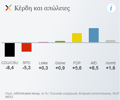 Σύμφωνα με το exit poll του πρώτου καναλιού της γερμανικής δημόσιας τηλεόρασης ARD, στην Μπούντεσταγκ επανέρχονται οι Φιλελεύθεροι (FDP) με 10,5%, ενώ ακολουθούν οι Πράσινοι με 9,5% και τελευταίο το κόμμα της Αριστεράς με 9%.