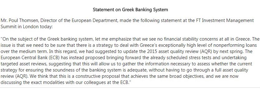 Σύμφωνα με ανακοίνωση του ΔΝΤ, ο κ. Τόμσεν στο περιθώριο του συνεδρίου που διοργανώνει το Ταμείο στο Λονδίνο ανέφερε τα εξής: «Oσον αφορά το ελληνικό τραπεζικό σύστημα, επιτρέψτε μου να τονίσω ότι δεν βλέπουμε καθόλου προβλήματα χρηματοοικονομικής σταθερότητας στην Ελλάδα».