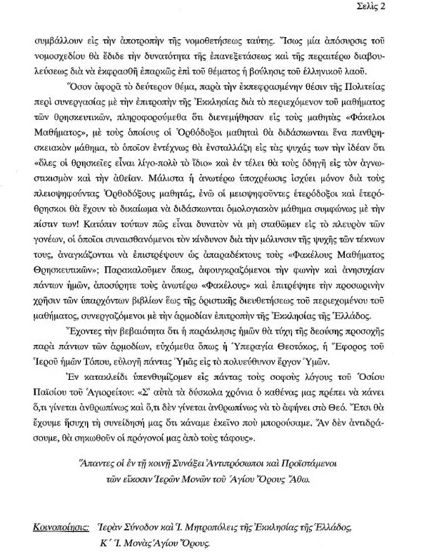 Στην ίδια επιστολή, οι Αγιορείτες εκφράζουν την αντίθεσή τους και με τον τρόπο διδασκαλίας των θρησκευτικών στα σχολεία.
