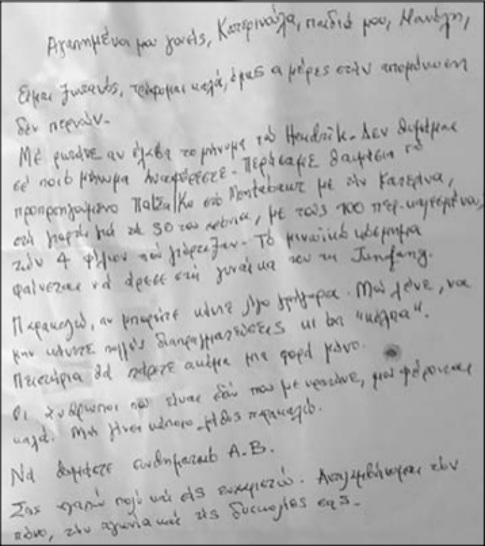 «Αγαπημένοι μου γονείς, Κατερινούλα, παιδιά μου, Μανόλη,
