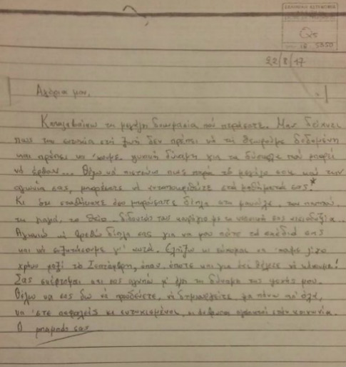 Πειστήρια θα πάρετε ακόμα μια φορά μόνο. Οι άνθρωποι που είναι εδώ που με κρατάνε, μου φέρονται καλά. Μη γίνει κάποιο λάθος παρακαλώ.