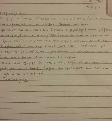 Μια ακόμα συγκλονιστική επιστολή του Μιχάλη Λεμπιδάκη, αυτή τη φορά από το σημειωματάριο που κρατούσε ο ίδιος, απευθυνόταν στα παιδιά του, από τα οποία ζητούσε να έχουν την ψυχική δύναμη για τα δύσκολα που θα έρθουν, ενώ τους ανέφερε πως τα αγαπά με όλη τη δύναμη της ψυχής του.