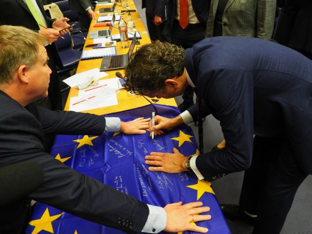 Σημαία της ΕΕ γεμάτη υπογραφές αποχαιρετιστήριο δώρο στον Σόιμπλε