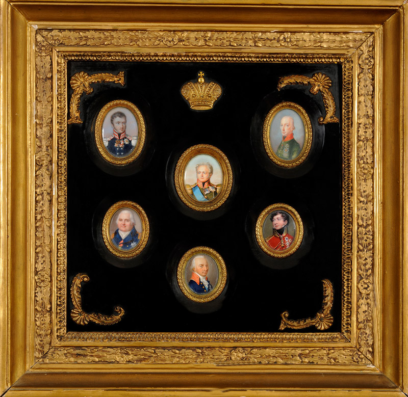 Τα πορτρέτα των έξι σημαντικότερων ηγεμόνων που πήραν μέρος στο Συνέδριο της Βιέννης, δωρίθηκαν από τους ίδιους στον Ιωάννη Καποδίστρια για το διπλωματικό του κύρος και αποτελούσαν τις έξι ταμπακιέρες των ηγεμόνων που ήταν ζωγραφισμένες σε όστρακο. Ο Ιωάννης Καποδίστριας τα τοποθέτησε μέσα σε κορνιζαρισμένο πλαίσιο από έβενο, με επίχρυση κορνίζα, το οποίο έστειλε δώρο στον πατέρα του, Αντώνιο-Μαρία Καποδίστρια.