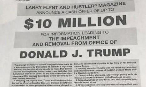 Με αγγελία στην Washington Post, ο Λάρι Φλιντ, εκδότης του αμερικανικού πορνογραφικού περιοδικού Hustler, ανακοίνωσε πως προσφέρει 10 εκατομμύρια δολάρια σε όποιον έχει πληροφορίες που θα μπορούσαν να οδηγήσουν στην καθαίρεση του προέδρου Ντόναλντ Τραμπ.