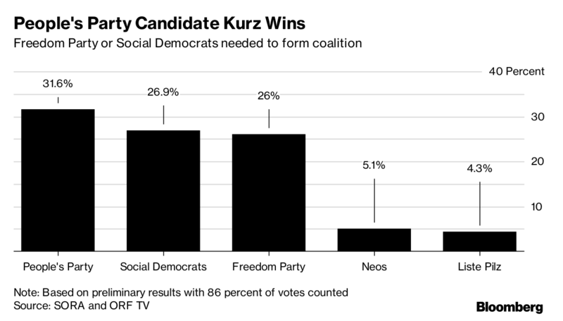 Σε μια εκλογική αναμέτρηση – θρίλερ στην οποία τα αυξημένα ποσοστά της ακροδεξιάς άφησαν πικρή γεύση στην ΕΕ, ο 31χρονος υποψήφιος του Λαϊκού Κόμματος (VPO) της Αυστρίας Σεμπάστιαν Κουρτς αναδείχθηκε νικητής των εκλογών με το ποσοστό του να κυμαίνεται γύρω στο 31,6%.