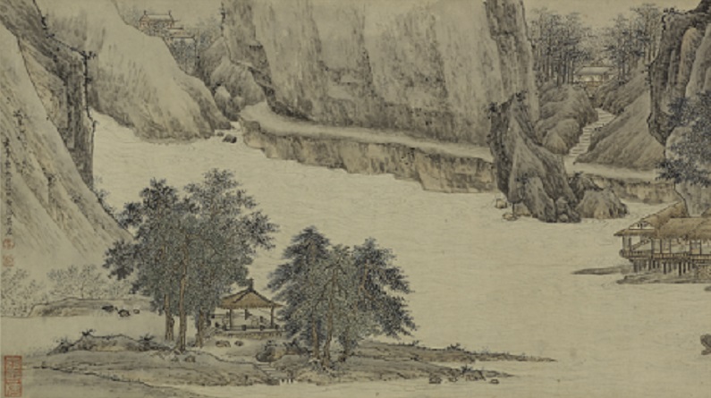 Λεπτομέρεια από τον εικονογραφημένο χάρτινο κύλινδρο του Κινέζου ζωγράφου Wu Hong της Δυναστείας των Τσίνγκ (17ος αι. π.Χ.) με τίτλο «Ταξιδεύοντας κατά μήκος του Διάφανου Ποταμού»