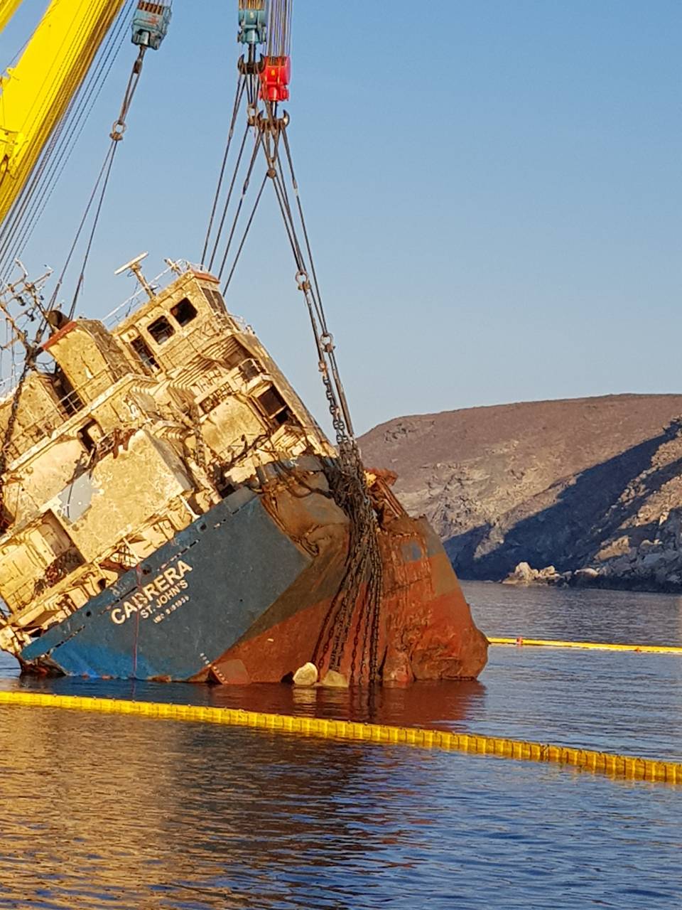 Ολοκληρώθηκε σήμερα με επιτυχία από την εταιρία MEGATUGS και SMIT στα βόρεια της Άνδρου, η ανέλκυση του πρυμναίου τμήματος (μηχανοστάσιο γέφυρα) του φορτηγού πλοίου "Cabrera" που είχε ημιβυθιστεί στη θαλάσσια περιοχή, μετά από προσάραξη τον περασμένο Δεκέμβριο, λόγω δυσμενών καιρικών συνθηκών.