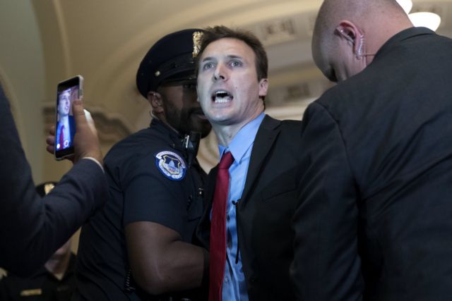 «Ο Τραμπ είναι προδοσία», φώναξε ο άνδρας ο οποίος στεκόταν μαζί με τα τηλεοπτικά συνεργεία, τη στιγμή που περνούσε από μπροστά του ο αμερικανός πρόεδρος μαζί με τον επικεφαλής της ρεπουμπλικανικής πλειοψηφίας της Γερουσίας, Μιτς Ο’ Κόνελ.