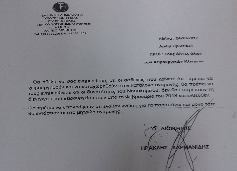 Συγκεκριμένα, ο διοικητής του νοσοκομείου, Ηρακλής Χαρμανίδης, με το έγγραφο που κοινοποιεί στους Διευθυντές όλων των Χειρουργικών Κλινικών, τους ενημερώνει ότι «οι ασθενείς που κρίνονται ότι πρέπει να χειρουργηθούν και να καταχωρηθούν στον κατάλογο αναμονής, θα πρέπει να τους ενημερώνετε ότι οι δυνατότητες του Νοσοκομείου δεν θα επιτρέπουν την διενέργεια χειρουργείων πριν τον Φεβρουάριο του έτους 2018 και εντεύθεν. Θα πρέπει να υπογράφουν ότι έλαβαν γνώση για τα παραπάνω και μόνο τότε θα εντάσσονται στο Μητρώο Αναμονής».