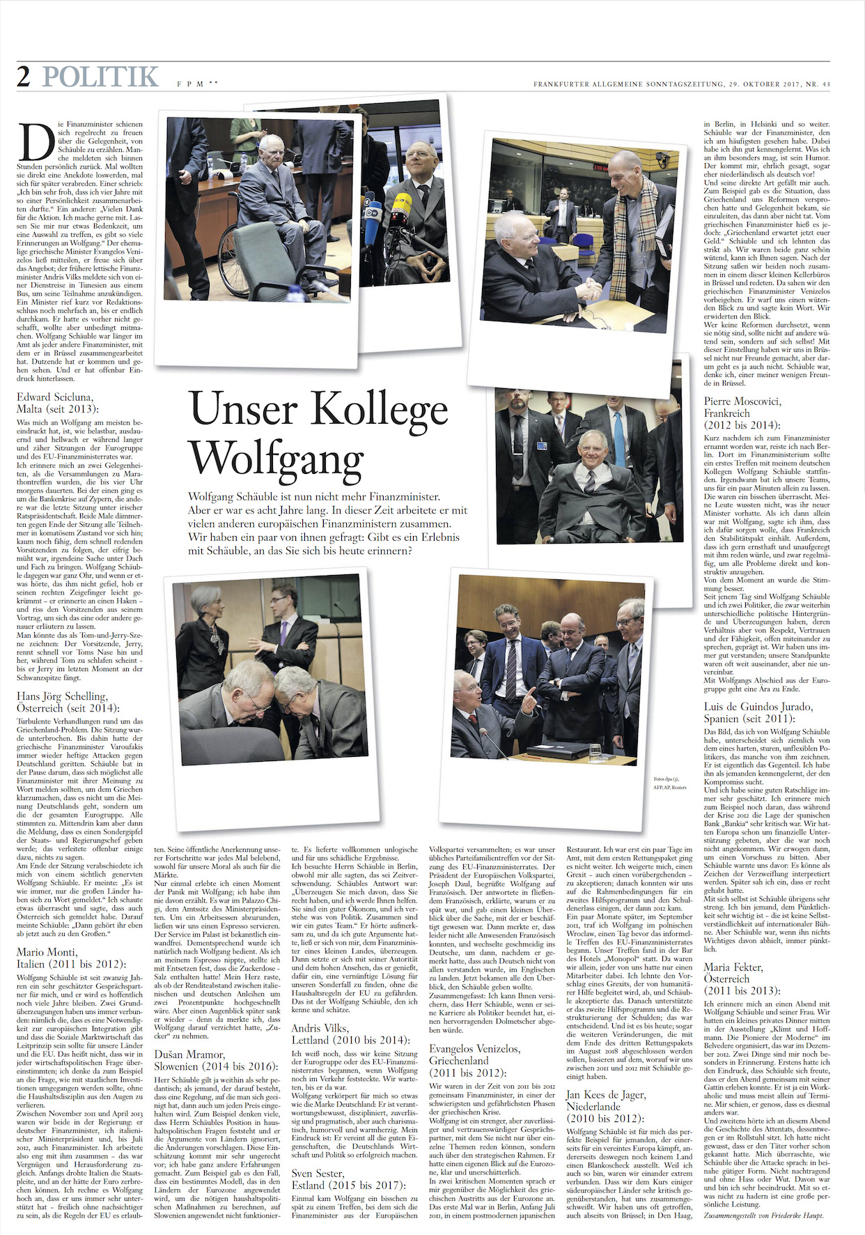 O Ευάγγελος Βενιζέλος συμμετείχε σε αφιέρωμα της εφημερίδας Frankfurter Allgemeine Sonntagszeitung στο οποίο διατελέσαντες υπουργοί οικονομικών από διάφορες χώρες αναφέρθηκαν στην εμπειρία της συνεργασίας τους με τον Βόλφγκανγκ Σόιμπλε.