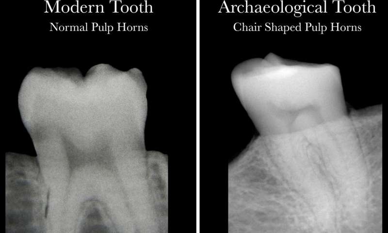 Αριστερά μια ακτινογραφία υγιούς σύγχρονου δοντιού και δεξιά αρχαίο δείγμα δοντιού που μαρτυρεί την ανεπάρκεια βιταμίνης D. Στο υγιές δόντι ο πολφός σχηματίζει μια «αψίδα» με… αφτιά στο επάνω μέρος. Στο δόντι ατόμου με ανεπάρκεια βιταμίνης D το επάνω μέρος του δοντιού έχει ασύμμετρο σχήμα ενώ και οι δύο πλευρές της αψίδας σχεδόν ενώνονται Credit: McMaster University
