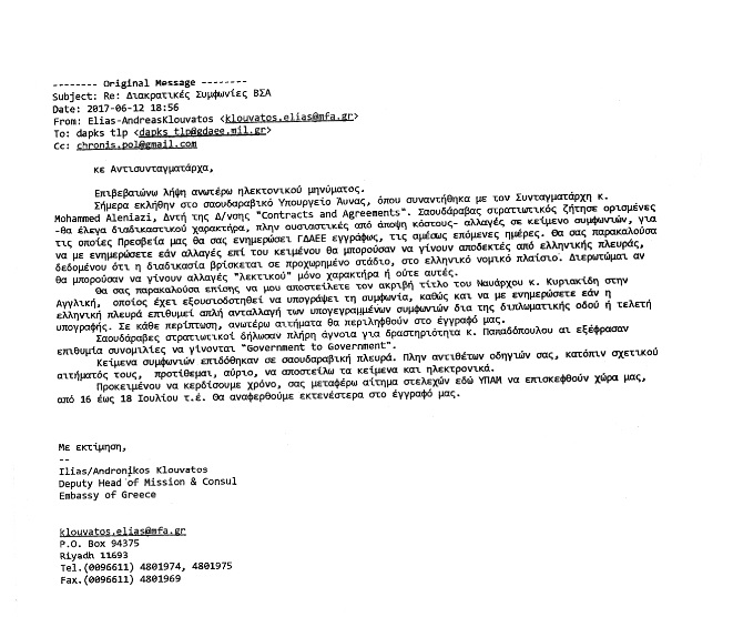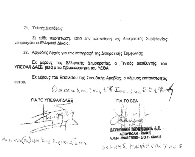 Οπως προκύπτει, ωστόσο, η προειδοποίηση του προξένου όχι μόνο αγνοήθηκε, αλλά την επόμενη κιόλας ημέρα ο γενικός διευθυντής της Γενικής Διεύθυνσης Αμυντικών Εξοπλισμών και Επενδύσεων (ΓΔΑΕΕ), αντιναύαρχος ε.α., Κυριάκος Κυριακίδης έσπευσε στη Θεσσαλονίκη προκειμένου να υπογραφεί με τον Παπαδόπουλο ένα ιδιωτικό συμφωνητικό που προβάλλεται ως διακρατική συμφωνία μεταξύ της κυβέρνησης της Ελληνικής Δημοκρατίας και του Βασιλείου της Σαουδικής Αραβίας.