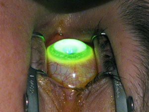 Μια νέα, πολλά υποσχόμενη μέθοδος, που προστέθηκε στην «εργαλειοθήκη» των μεθόδων αντιμετώπισης του κερατόκωνου, και μπορεί να ανακόψει την εξελικτική πορεία της νόσου, όταν εφαρμόζεται έγκαιρα και σωστά, είναι η μέθοδος «διασύνδεσης των ινών κολλαγόνου» με ριβοφλαβίνη (cross-linking, CXL). Σε αυτή τη μέθοδο (εικόνα 4) εφαρμόζεται τοπικά στον κερατοειδή ειδικό διάλυμα ριβοφλαβίνης και στη συνέχεια υπεριώδης ακτινοβολία UV-A για περίπου 30 λεπτά. Αυτό έχει ως αποτέλεσμα τη δημιουργία νέων δεσμών ανάμεσα στις ίνες κολλαγόνου που περιέχει ο κερατοειδής και την αύξηση της σταθερότητάς του και της αντοχής του (κατά περίπου 3 φορές).