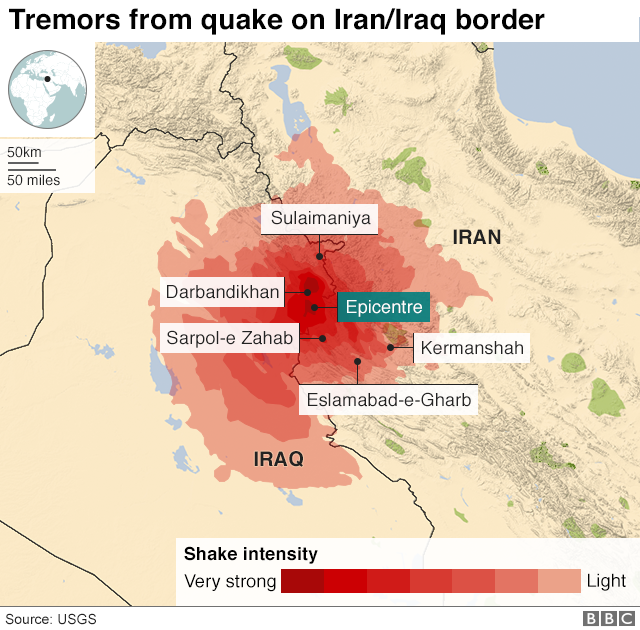 Το επίκεντρο του σεισμού των 7,3 βαθμών εντοπίστηκε κοντά στα σύνορα με το Ιράκ, σε απόσταση περίπου 50 χιλιομέτρων βόρεια του Σαρ-ε-Πολ-ε-Ζαχάμπ, της πόλης που έχει πληγεί περισσότερο. Μόνο στην πόλη αυτή των 85.000 κατοίκων έχουν αναφερθεί 280 νεκροί. Νωρίς το πρωί οι διασώστες έβγαλαν ζωντανούς από τα συντρίμμια μια μητέρα με το μωρό της.