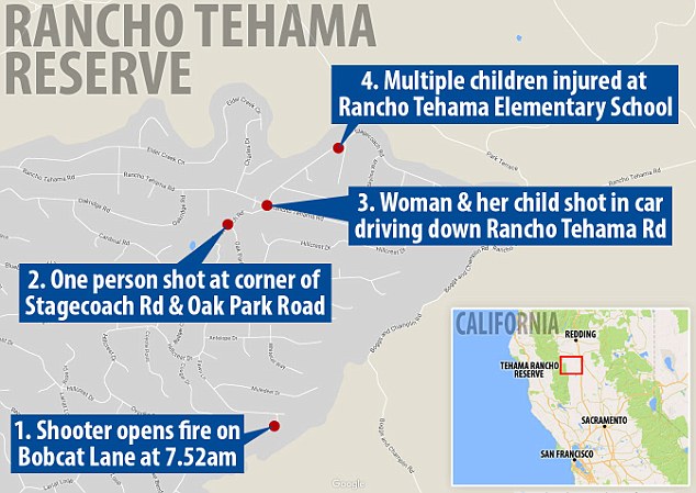 Το πρώτο περιστατικό έλαβε χώρα λίγο πριν τις 8 το πρωί τοπική ώρα, περίπου 120 μίλια βορειοδυτικά του Σακραμέντο. Εκτιμάται ότι ξεκίνησε από σπίτι, όπου και σημειώθηκε ενδοοικογενειακή βία και κατέληξε στο σχολείο.