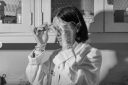 Στις ασπρόμαυρες φωτογραφίες, η διακρίνεται η Άννα Φρανκ που κοιτάζει από το παράθυρο και χαμογελά ή κάθεται σε μια πολυθρόνα σε μια βεράντα.