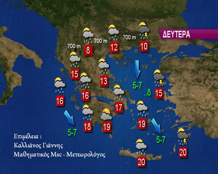 Σύμφωνα με τον μετεωρολόγο Γιάννη Καλλιάνο, στον 1ο προγνωστικό χάρτη Ελλάδος, αν εξαιρέσουμε τις ανατολικές περιοχές της Πελοποννήσου, στην υπόλοιπη Ελλάδα ο καιρός θα είναι κατά διαστήματα βροχερός μέσα στη Δευτέρα. Αυτό σημαίνει ότι, τόσο στο Ιόνιο, όσο στα ηπειρωτικά τμήματα και το Αιγαίο, κατά διαστήματα θα εκδηλώνονται τοπικές βροχές. Πιο δυνατά φαίνεται ότι θα είναι τα φαινόμενα σε περιοχές της Θράκης, των νησιών του Ανατολικού Αιγαίου αλλά και των Δωδεκανήσων, όπου εκεί θα εκδηλωθούν και τοπικές καταιγίδες.