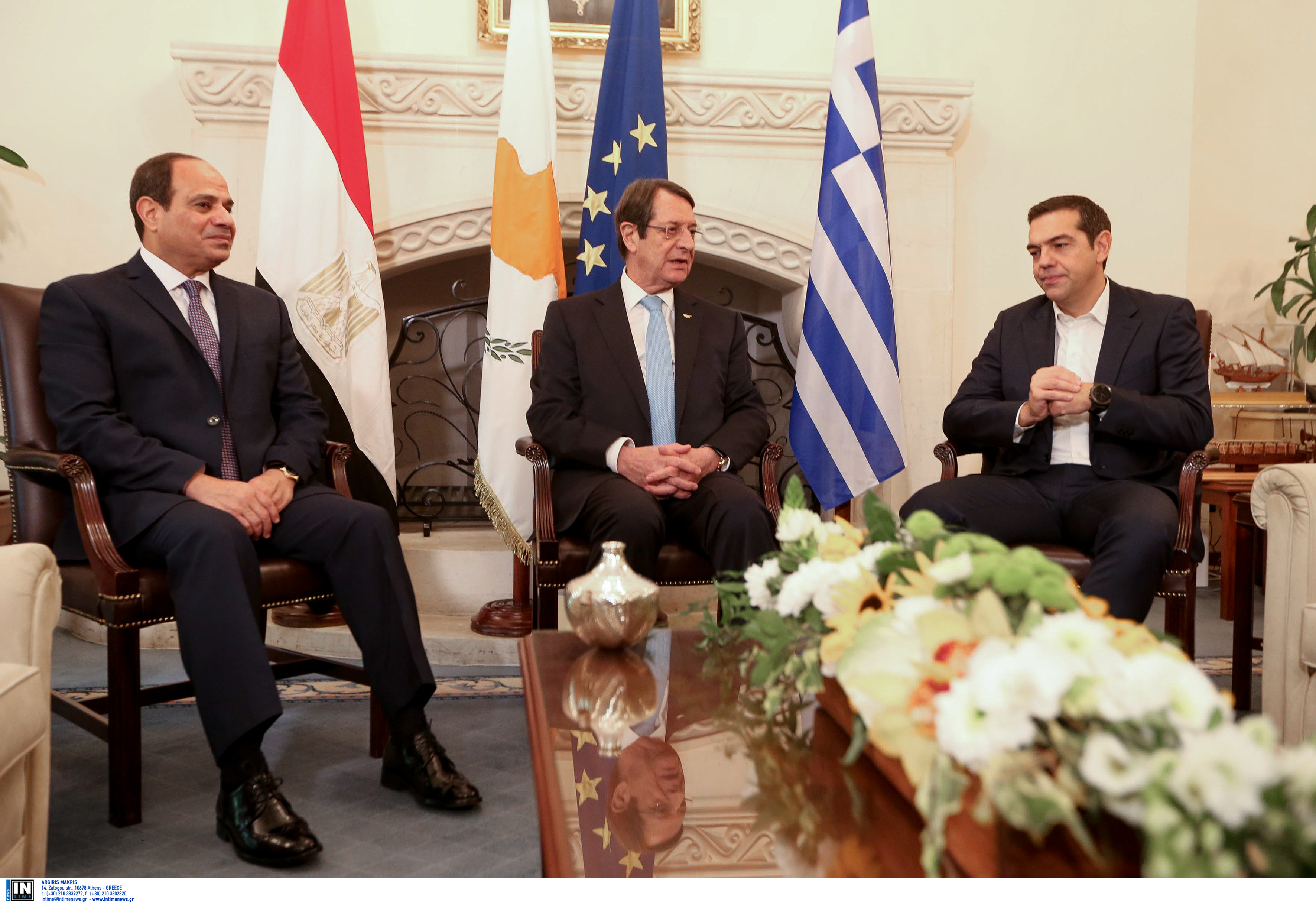 Kύπρος, Ελλάδα και Αίγυπτος δεσμεύτηκαν «να προχωρήσουν γρήγορα στις διαπραγματεύσεις σχετικά με την οριοθέτηση των κοινών θαλάσσιων συνόρων τους», όπως αναφέρουν σε Κοινή Διακήρυξη οι ηγέτες των τριών χωρών, Νίκος Αναστασιάδης, Αλέξης Τσίπρας και Αμπντέλ Φατάχ Αλ Σίσι.