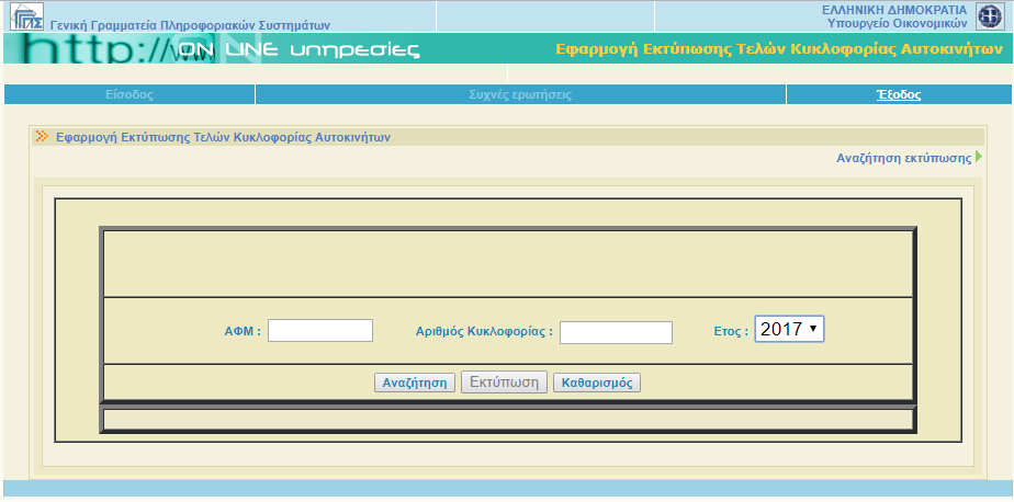 Στη συνέχεια κάνει κλικ στο πεδίο «ΕΙΣΟΔΟΣ». Αμέσως θα μεταφερθεί στην ηλεκτρονική φόρμα, όπου θα πρέπει να αναγράψει τον ΑΦΜ του και τον αριθμό κυκλοφορίας του οχήματός του και να κάνει κλικ στο πεδίο «Αναζήτηση».