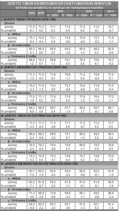Το α΄ εξάμηνο του 2017, τα μισθώματα των γραφείων για το σύνολο της χώρας αυξήθηκαν οριακά κατά 0,1% σε σχέση με το β΄ εξάμηνο του 2016 (προσωρινά στοιχεία). Με βάση τα αναθεωρημένα στοιχεία, οι αντίστοιχοι ρυθμοί μεταβολής ήταν 0,4% το α΄ εξάμηνο του 2016 και -0,4% το β΄ εξάμηνο του 2016 σε σχέση με το αμέσως προηγούμενο εξάμηνο, ενώ για το σύνολο του 2016 τα μισθώματα των γραφείων υποχώρησαν με μέσο ετήσιο ρυθμό μεταβολής 0,3%.