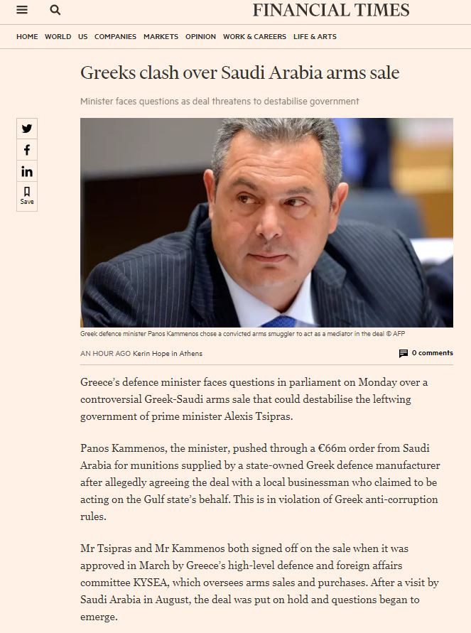 Οι Financial Times γράφουν ότι ο Πάνος Καμμένος προχώρησε σε μία παραγγελία 66 εκατ. ευρώ από τη Σαουδική Αραβία για πολεμοφόδια που έχουν κατασκευαστεί από ελληνικό αμυντικό εργοστάσιο, ενώ η συμφωνία έγινε με τοπικό επιχειρηματία ο οποίος υποστήριξε ότι ενεργούσε εκ μέρους της Σαουδικής Αραβίας.