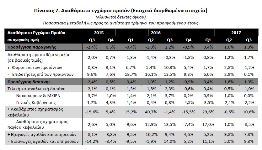 Αύξηση κατά 7,8% σε σχέση με το 3° τρίμηνο του 2016 παρουσίασαν οι εξαγωγές αγαθών και υπηρεσιών. Οι εξαγωγές αγαθών αυξήθηκαν κατά 2,8% ενώ οι εξαγωγές υπηρεσιών αυξήθηκαν κατά 12,6%.