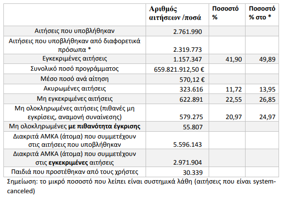 Σύμφωνα με τα στοιχεία που έδωσε στη δημοσιότητα η Ηλεκτρονική Διακυβέρνηση Κοινωνικής Ασφάλισης (ΗΔΙΚΑ) (9/12/2017, 2:00 μ.μ.) μέχρι στιγμής έχουν εγκριθεί 1.157.347 αιτήσεις, οι ακυρωμένες ανέρχονται σε 323.61, οι μη εγκεκριμένες αιτήσεις αριθμούν 622.891, οι μη ολοκληρωμένες αιτήσεις (πιθανές μη εγκρίσεις, αναμονή συναίνεσης) είναι 579.275 ενώ έχουν υποβληθεί 2.761.990 αιτήσεις.