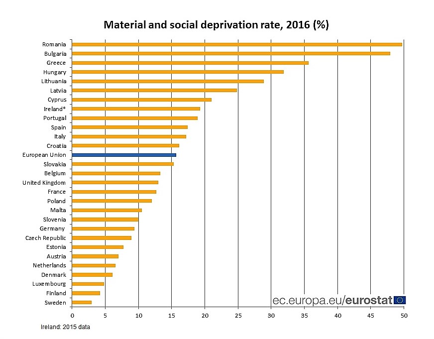 Στην κορυφή της λίστας βρίσκονται η Ρουμανία, όπου το 50% του πληθυσμού αντιμετωπίζει υλικές και κοινωνικές στερήσεις, και η Βουλγαρία όπου το αντίστοιχο ποσοστό ανέρχεται στο 48%.