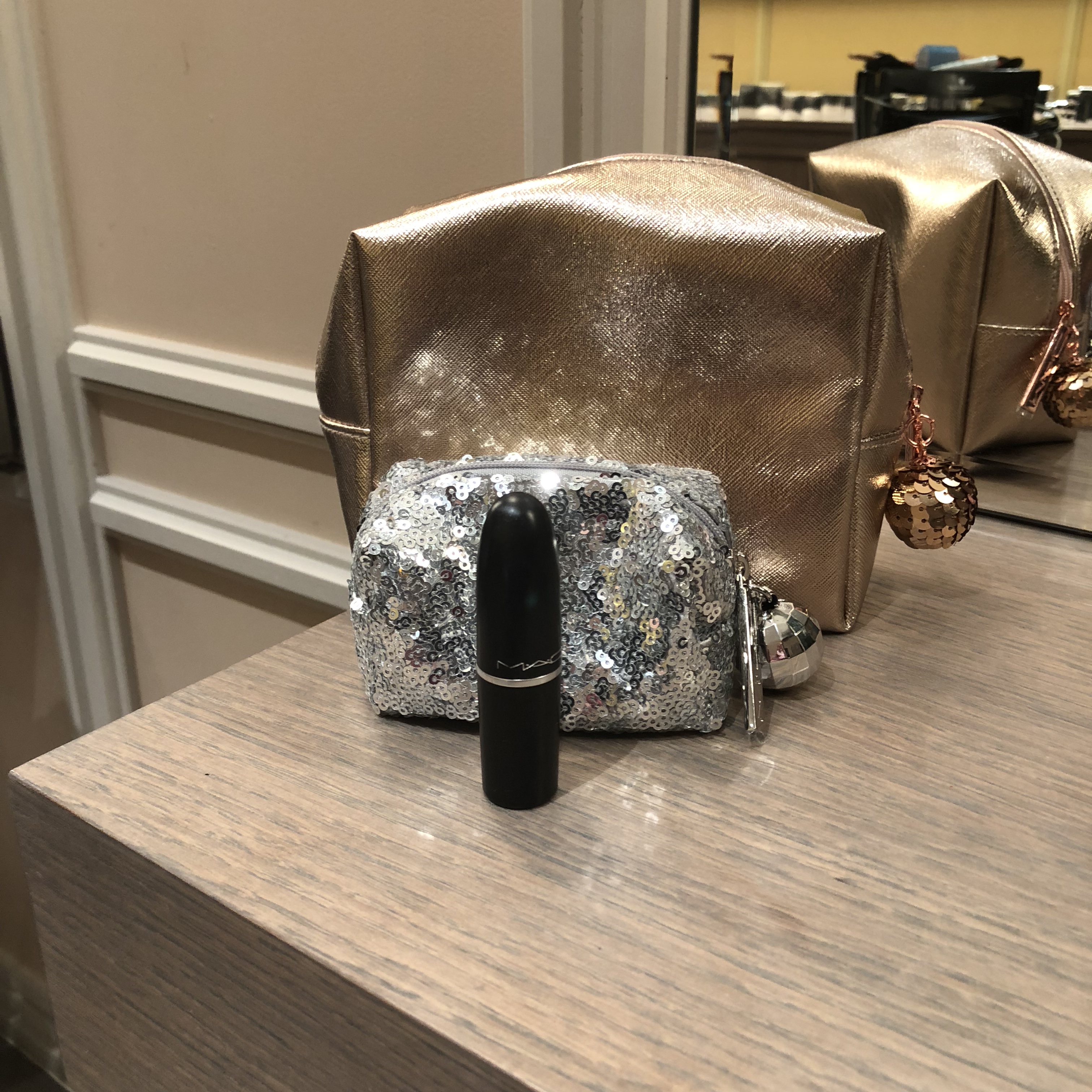 Το best seller κραγιόν που σχεδίασε η Σήλια Κριθαριώτη για την MAC, μπροστά από τα εορταστικά συλλεκτικά τσαντάκια του brand.