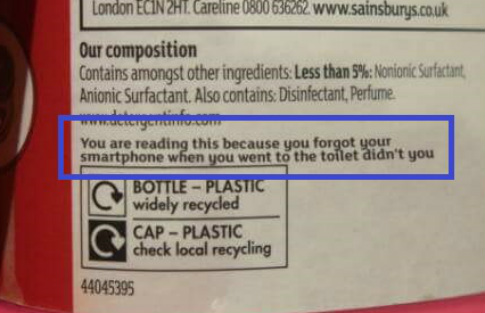 Όπως μπορείτε να δείτε στη φωτογραφία, η ετικέτα μετά τα συστατικά και τις απαραίτητες προφυλάξεις, αναγράφει: «Το διαβάζεις αυτό, επειδή ξέχασες το κινητό όταν πήγες τουαλέτα, έτσι δεν είναι;», αποκαλύπτοντας με αυτό τον τρόπο την αγαπημένη συνήθεια των περισσότερων ανθρώπων να διαβάζουν τις ετικέτες των προϊόντων που βρίσκονται στο χώρο του μπάνιου για να περάσει η ώρα μέχρι να βγουν από εκεί.
