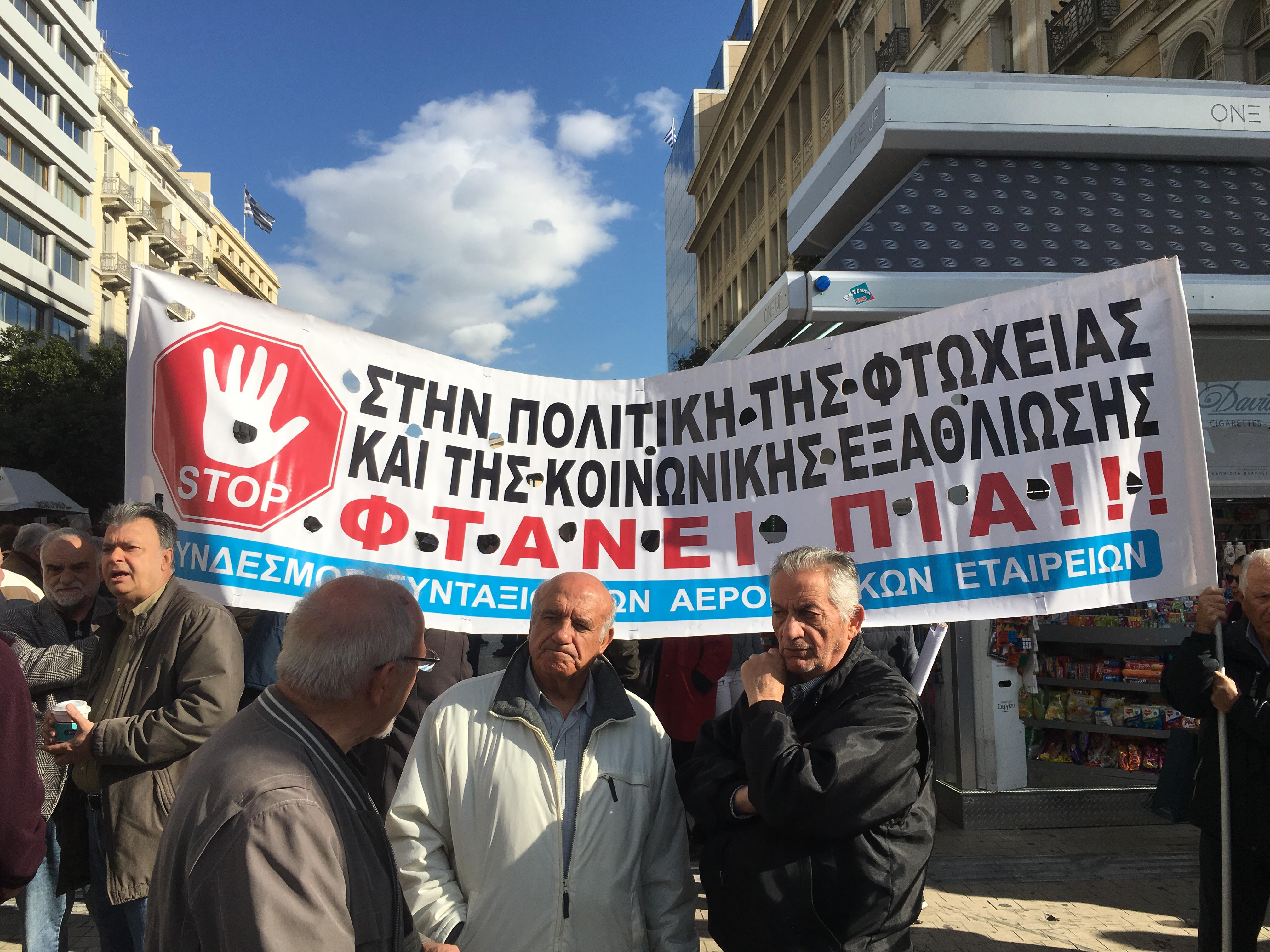 Οι διαδηλωτές φωνάζοντας συνθήματα κατά της κυβέρνησης ζήτησαν μεταξύ άλλων να υπογραφούν γενικές συλλογικές συμβάσεις και να σταματήσουν οι πλειστηριασμοί.
