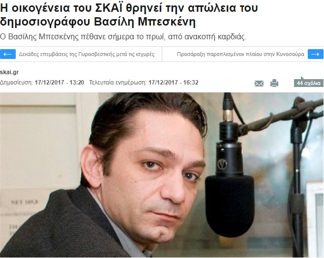 Η οικογένεια του Σκάι θρηνεί την ξαφνική απώλεια του δημοσιογράφου Βασίλη Μπεσκένη, αναφέρει το σχετικό δημοσίευμα στο skai.gr.