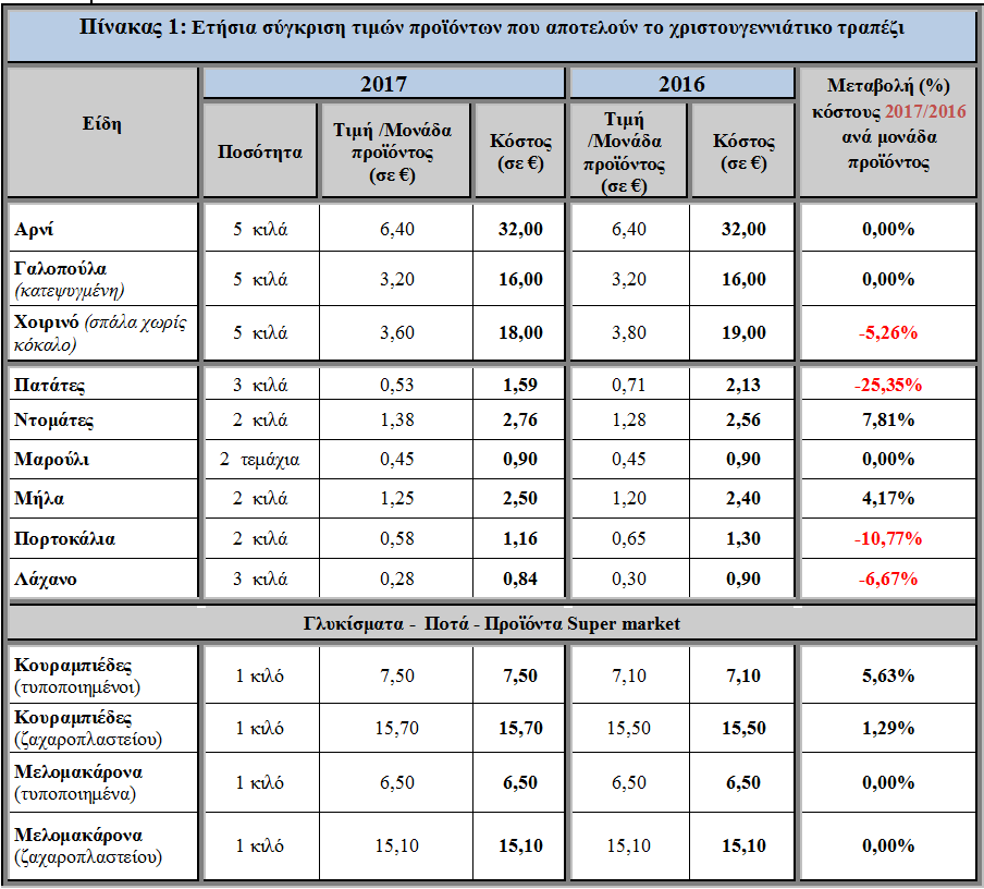 Φθηνότερο κατά 1,29% σε σχέση με το 2016, εκτιμάται το φετινό χριστουγεννιάτικο τραπέζι, σύμφωνα με δειγματοληπτικό έλεγχο που πραγματοποίησε το Ινστιτούτο Εμπορίου και Υπηρεσιών (ΙΝ.ΕΜ.Υ.) της ΕΣΕΕ κατά την περίοδο 11 έως 16 Δεκεμβρίου 2017.