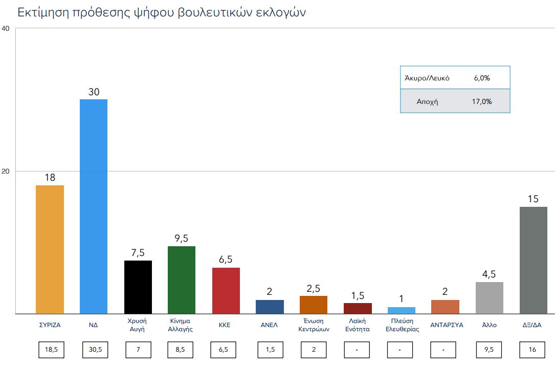 Στην τρίτη θέση βρίσκεται το Κίνημα Αλλαγής, με 9,5 μονάδες, τέταρτη η Χρυσή Αυγή με 7,5% ενώ στο 6,5% ακολουθεί το ΚΚΕ.